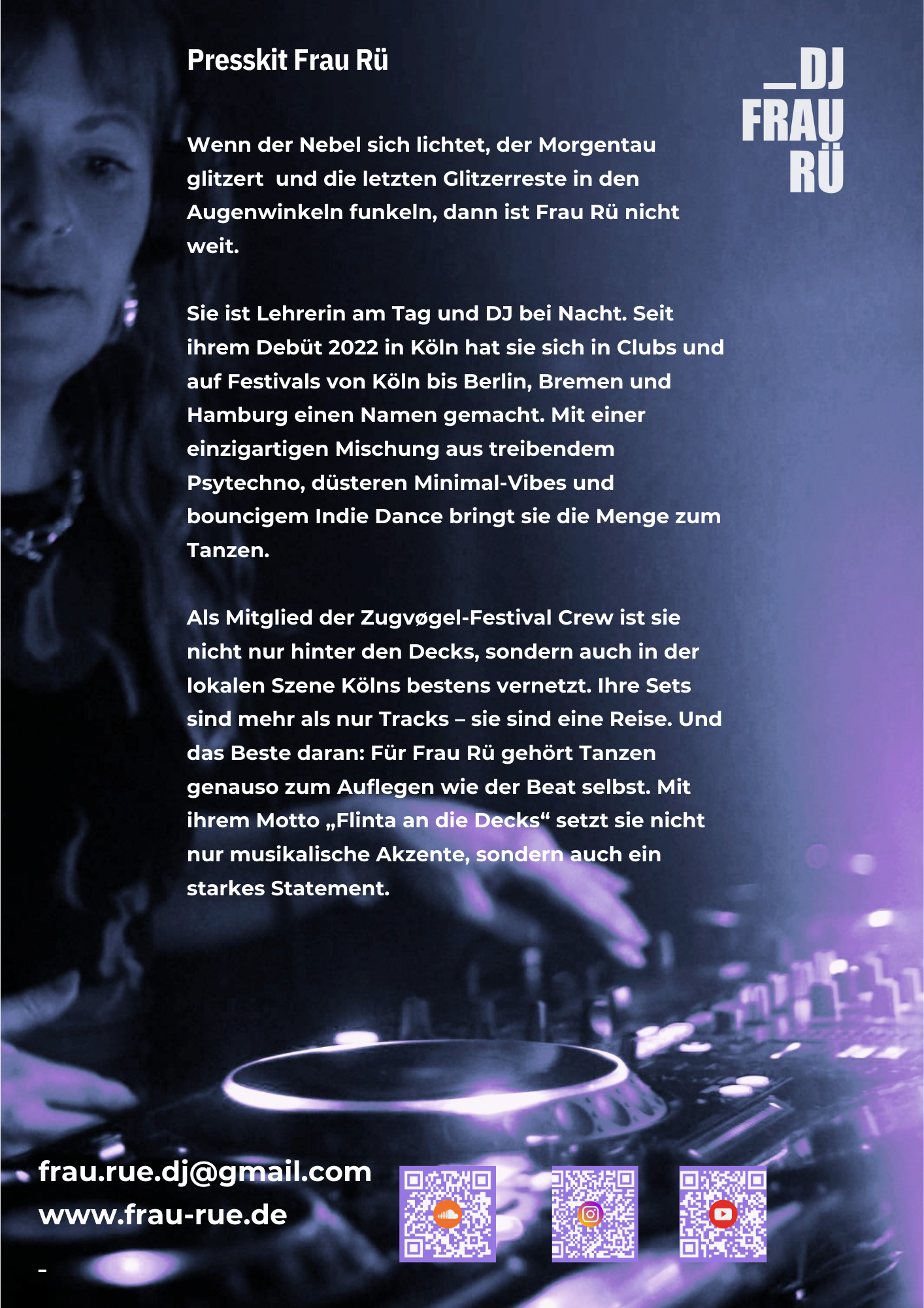 Als Mitglied der Zugvøgel-Festival Crew ist sie nicht nur hinter den Decks, sondern auch in der lokalen Szene Kölns bestens vernetzt. Ihre Sets sind mehr als nur Tracks – sie sind eine Reise. Und das Beste daran: Für Frau Rü gehört Tanzen genauso zum Auflegen wie der Beat selbst. Mit ihrem Motto „Flinta an die Decks“ setzt sie nicht nur musikalische Akzente, sondern auch ein starkes Statement.